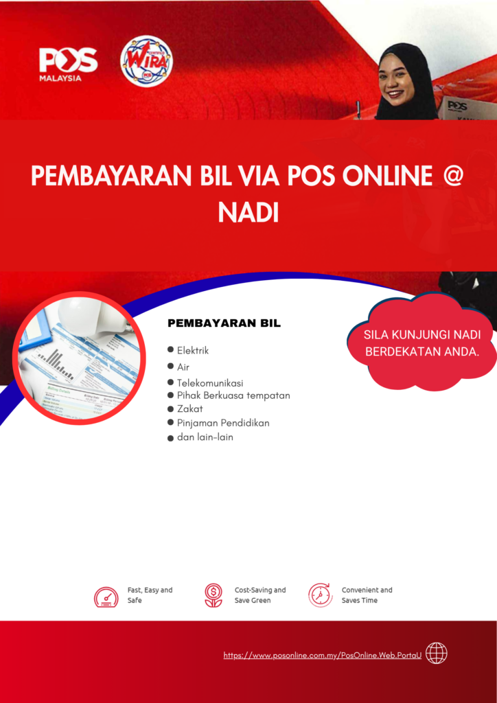 Kini anda boleh membuat pelbagai jenis pembayaran bil secara mudah dan selamat melalui perkhidmatan POS Online yang disediakan di Pusat NADI berdekatan anda. Perkhidmatan ini memudahkan urusan harian anda tanpa perlu ke pejabat pos utama.